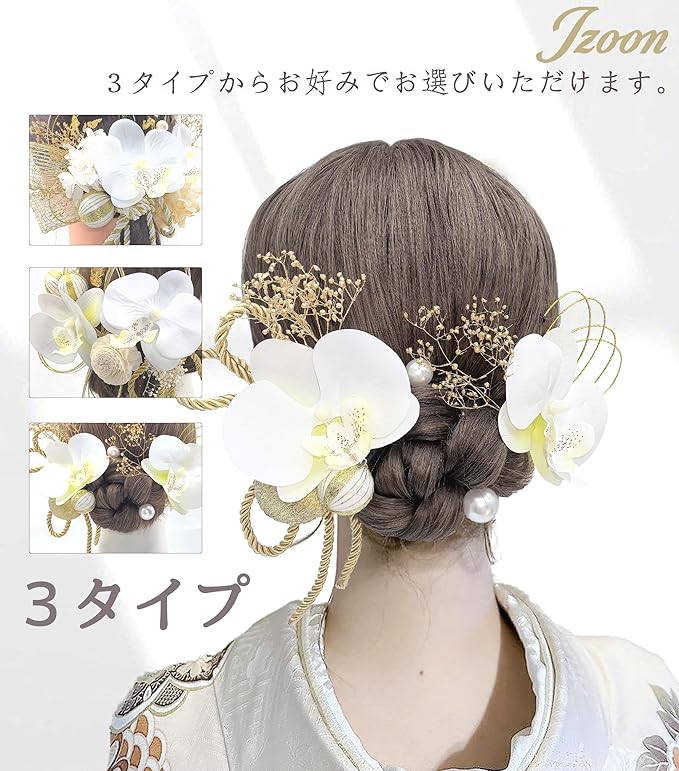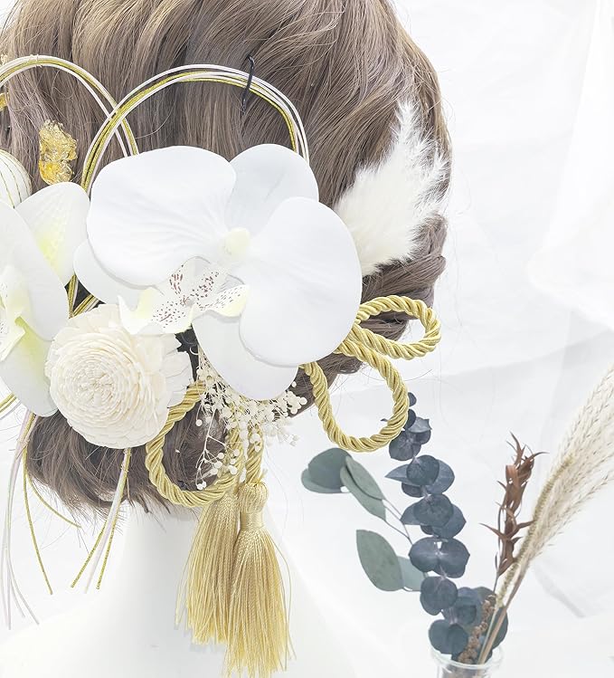 [JZOON] 成人式 髪飾り 胡蝶蘭 ドライフラワー ダリア コチョウラン あじさい 和玉 白 ホワイト 水引 七五三 浴衣 袴 着物 飾り 振袖 和装 卒業式 結婚式 ウェディング 花 かわいい 手作り 専用ケース付き