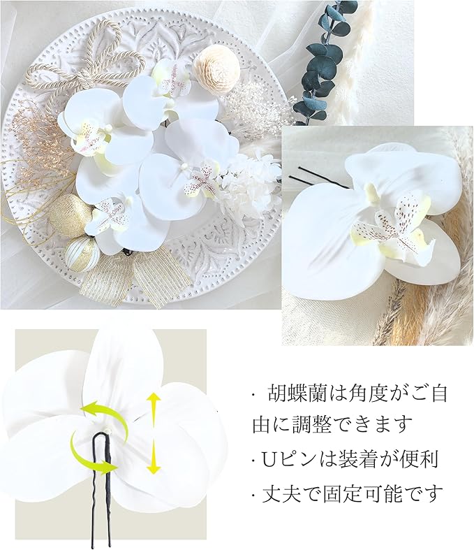 【多様な場面で】結婚式、結納、前撮り、フォトウェディングなどで着る白無垢やウェディングドレス、白い洋服などにピッタリです。もちらん、着物や浴衣などにも気軽にお使いいただけます。Uピン付きでセフルでお着付けでき、様々なアレンジをお楽しみいただけます。