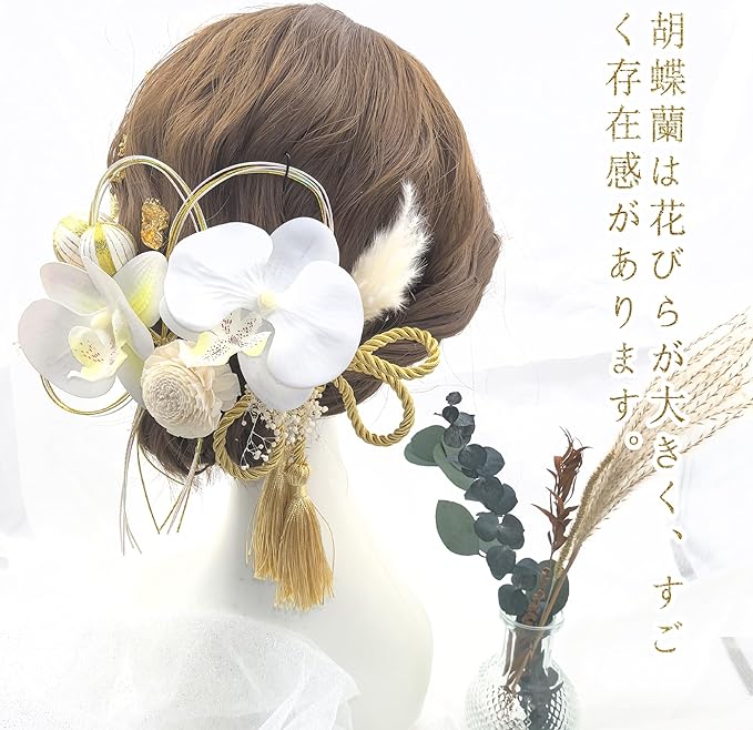 【純白胡蝶蘭】大輪の純白胡蝶蘭はまるで本物のような美しい質感で、上品でエレガントなイメージを作ってくれます。かなり大きめなサイズが周りの目を引き、小顔効果も期待できます。ほかのお花やかすみ草、和風の和玉、組紐、水引きなどと相まって、ヘアメイクに華を添えてくれます。