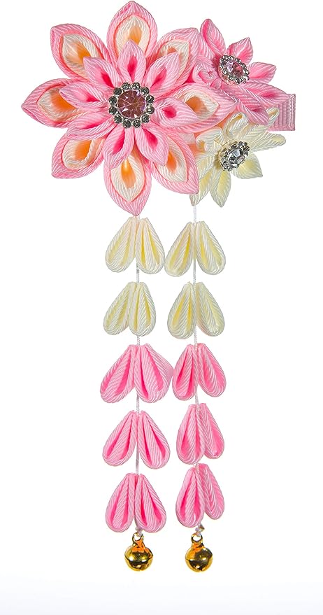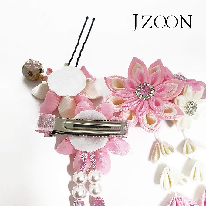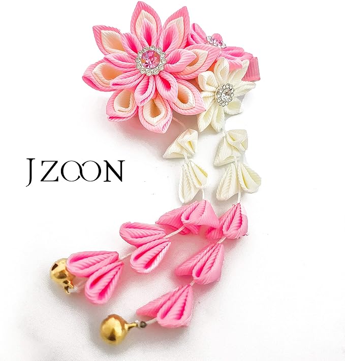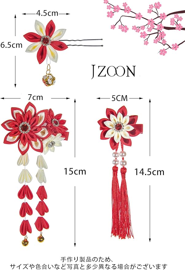 [JZOON] 髪飾り菊桜蝶 3点セット つまみ細工 成人式 七五三 浴衣 袴 着物 振袖 和装 花 卒業式 結婚式 鈴付き 手作り 赤 青 紫 ピンク 4色 菊 桜 蝶 全12選