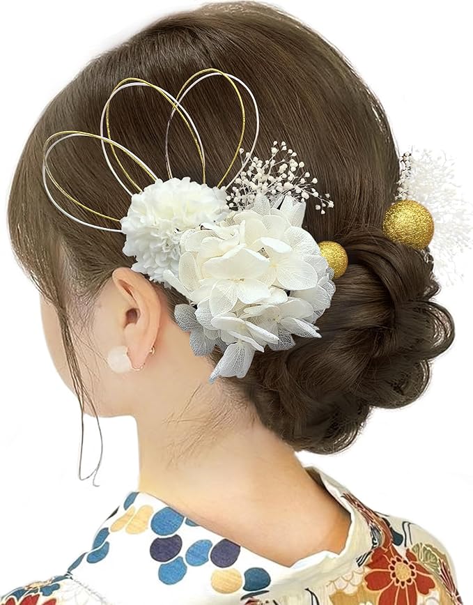 【華やかなデザイン】この髪飾りは、日本の伝統的な美意識と現代のファッションセンスを融合させた華やかなデザインが特徴です。繊細な花びらが細部まで丁寧に作り込まれ、上品で高級感あふれる仕上がりとなっています。水引やホワイドパールのデザインなど、和服の美しさを一層引き立てます。