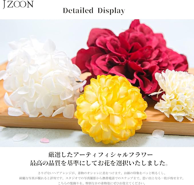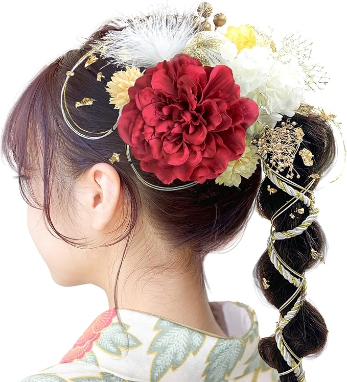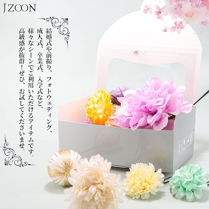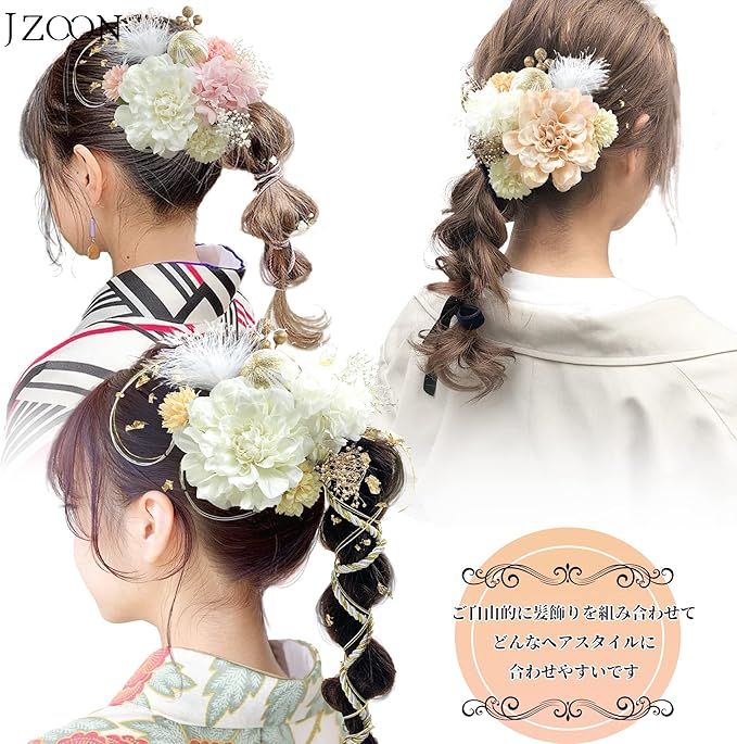 使用場面:結婚式、成人式、花火大会、卒業式、お祭りなどでの着物や浴衣にピッタリ!各パーツがUピン付きで、自由にアレンジできます。