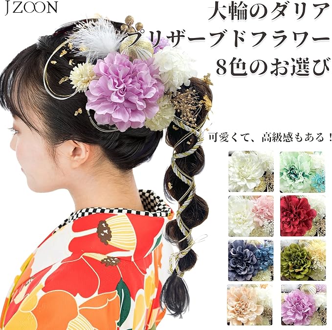 [JZOON] 髪飾り 成人式 髪飾り 8色 ドライフラワー 造花飾り 水引 紐 ダリア ヘアーアクセサリー 和玉 かすみ草 金箔 人気 和服 着物 振袖 袴 花 浴衣 成人式 七五三 結納 卒業式 入学式 結婚式 発表会 (パープル)