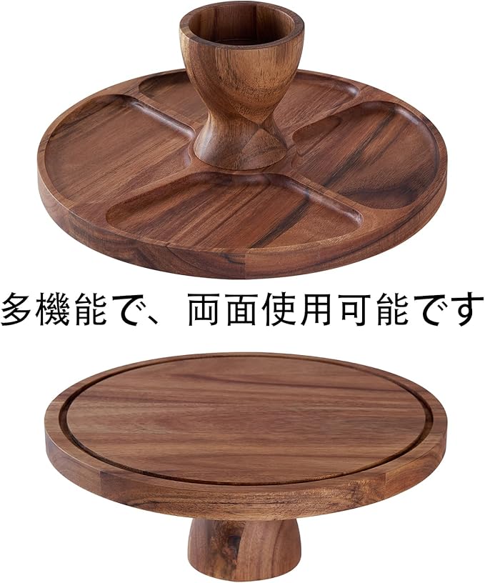双面デザイン:この12インチの丸型アカシアウッドケーキスタンドはリバーシブルデザインで、一方はケーキスタンドとして、もう一方はスナックトレイとして使用できます。