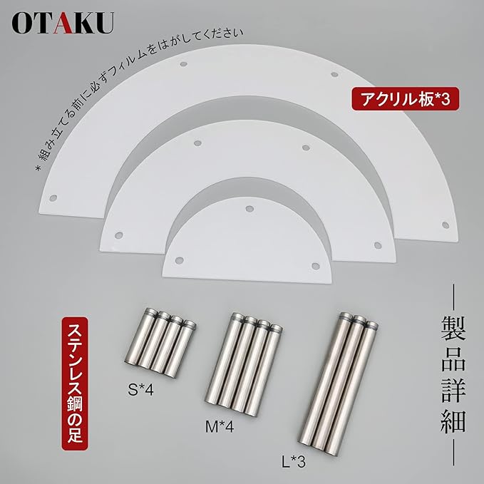 サイズ:この3段アクリルケーキスタンドは、銀色の金属支柱(S:5cm/Ⅿ:8cm/Ⅼ:12cm)で支えられたアクリルアーチトレーで構成されています。階層型3段ケーキプレート設計で、上から下へ自然な広がりを表現: ✅ 最上段:直径15.9cm・奥行8.2cm ✅ 中段:直径28cm・奥行6cm ✅ 最下段:直径40cm・奥行6cm