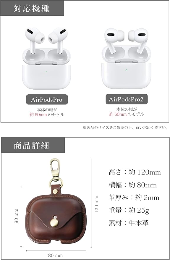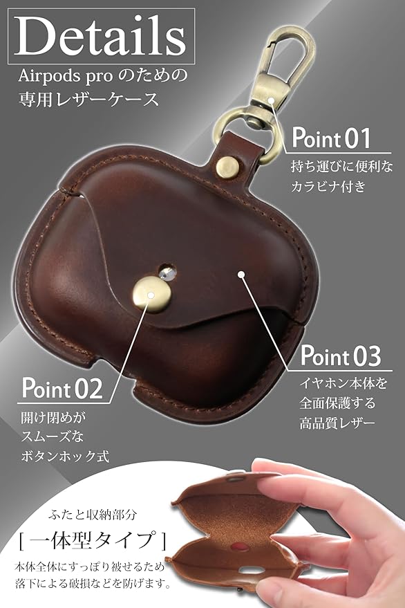 【本革仕様と熟練の技】長くお使いいただけるように、素材、縫製、フィット感にこだわりました。素材:質感抜群の品質の高い「本革」を使用しました。毎日の持ち歩きにも耐えられる高耐久性と、長年使うことで経年変化を楽しめることは本革ならでは。フィット感:AirPods Proがぴったり収まるフィット感は、熟練のなせる技。手に取っていだだけると品質の良さを実感いただけると思います