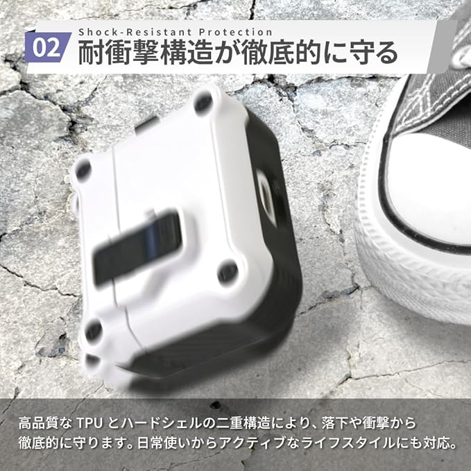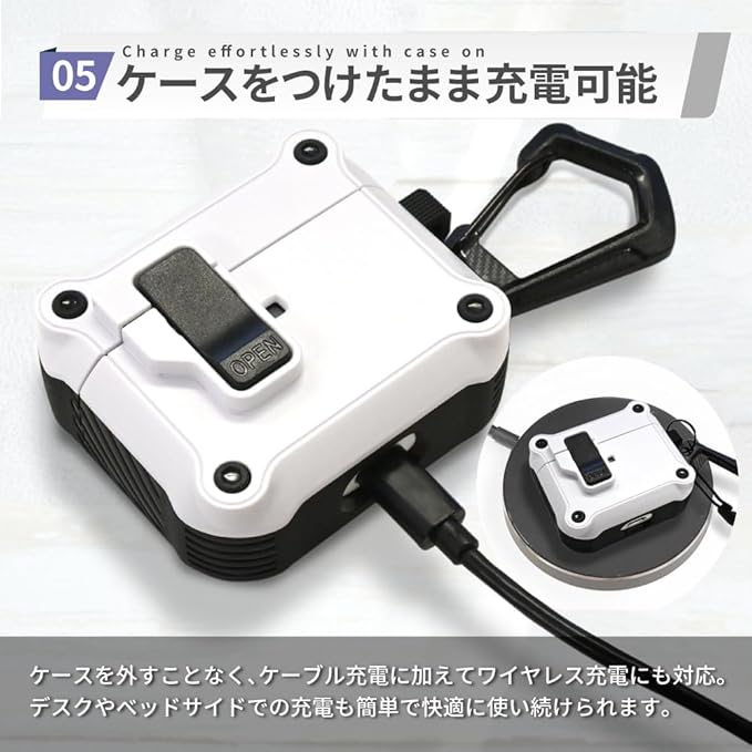 - AirPods対応ケース - TPU PC素材の頑丈なハードシェルタイプAirPods対応ケース バックなどに付けられるカラビナ付きです! ■商品仕様 素材:TPU(熱可塑性ポリウレタン)、PC(ポリカーボネート) 仕様:高耐衝撃・ワイヤレス充電対応 【注意事項】 ※本体は付属しておりません。 製品の色味に関しては、お使いのデバイスの表示性能や設定により 変化する可能性がありますのでご注意ください。 お客様に満足して頂きたく品質改善を日々しております。 それに伴い予告なしにデザインが変更する場合がございます。 ご了承くださいませ。随時商品ページにてお知らせいたします。