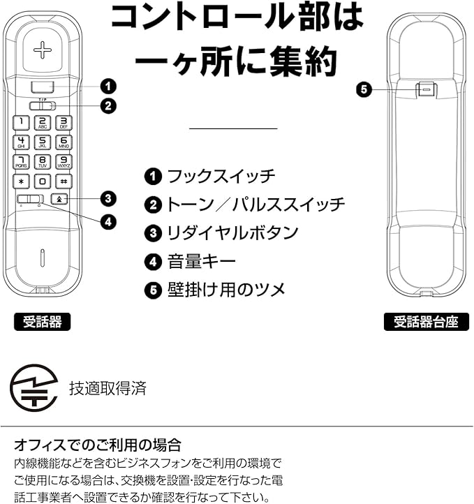 【JATE規格】この電話機はJATE規格を取得しており、NTTのアナログ回線に準拠しています。光電話やIP電話機としても使用可能で、家庭用電話機としてもビジネスフォンとしても安心して利用できます。防犯や内線通話が必要な場面でも、安定した通話品質を提供する固定電話機です。通話のみのシンプルな機能が魅力の電話機で、通販でも購入可能です