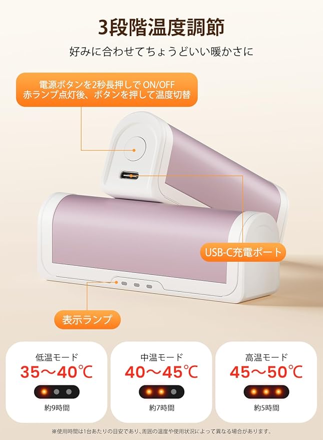 【3段階温度調節&バッテリー残量表示機能】充電式カイロは低温・中温・高温の3段階で温度調節が可能。周囲の気温やご自身の体感に合わせて自由に選べます。低温モード(赤ランプ1つ点灯:約35~40℃)、中温モード(赤ランプ2つ点灯:約40~45℃)、高温モード(赤ランプ3つ点灯:約45~50℃)。寒冷地での生活、屋外作業、スポーツ観戦など幅広いシーンで大活躍します。使用時間は、低温モード:約9時間、中温モード:約7時間、高温モード:約5時間。低温モードでは、2個合計で最長約18時間連続使用が可能です。(※使用時間は環境温度によって変動します)また、電源ボタンを2回押すと青ランプが点灯し、バッテリー残量を確認可能(1つ点灯=0~33%、2つ=34~66%、3つ=67~100%)。※低温やけど防止のため、同じ箇所に長時間あてないでください。