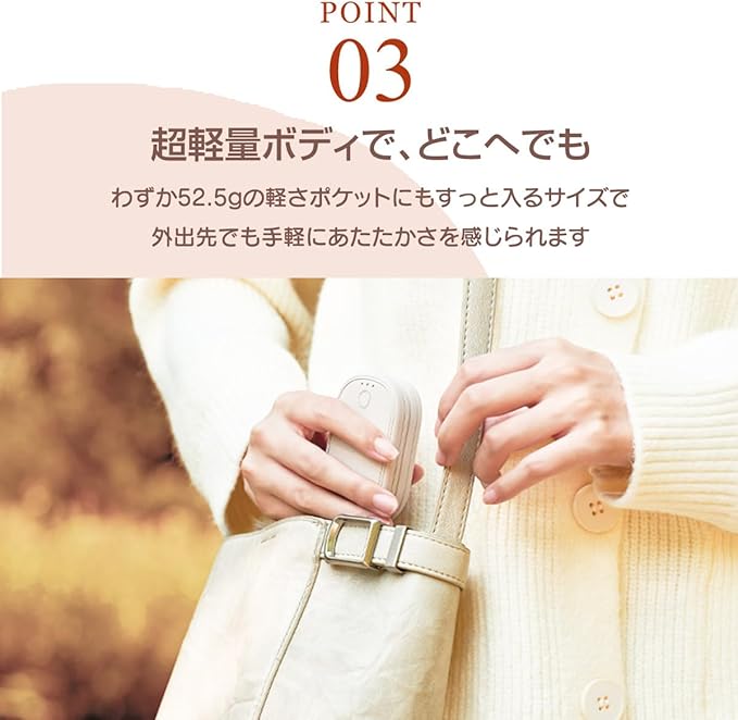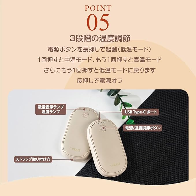 【3段階温度調節】約40℃/50℃/55℃の3段階温度設定を搭載。季節や使用シーンに合わせて最適な温度を自由に選べます。弱モードなら長時間使用、中・強モードなら素早く暖めたい時に便利です。※連続使用時間(5℃環境):高温 約2.6時間 / 中温 約3.4時間 / 低温 約3.8時間。