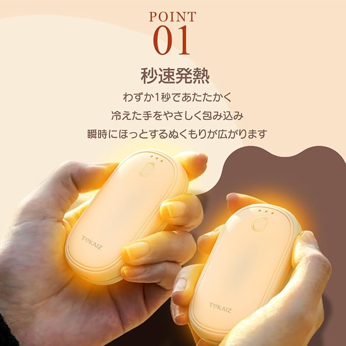 【即暖・1秒速熱】電源を入れた瞬間からじんわり暖かい。独自の発熱構造により、効率よく熱を伝え、手のひらをしっかり温めます。寒い朝の通勤や屋外イベントでも、待たずにすぐ温まります。