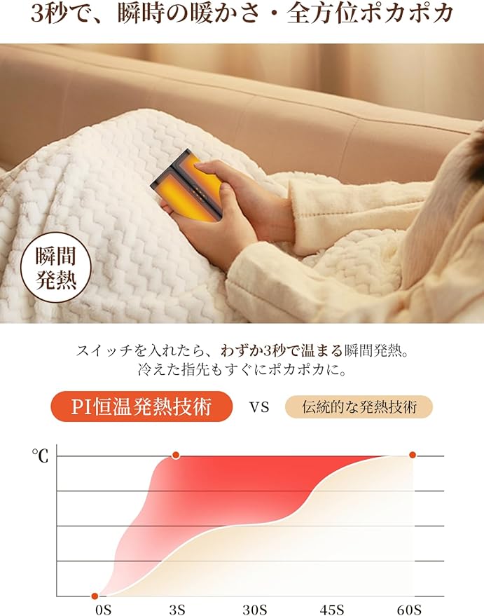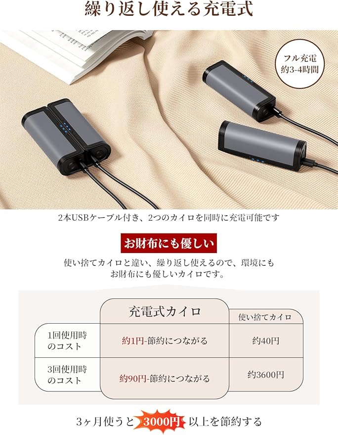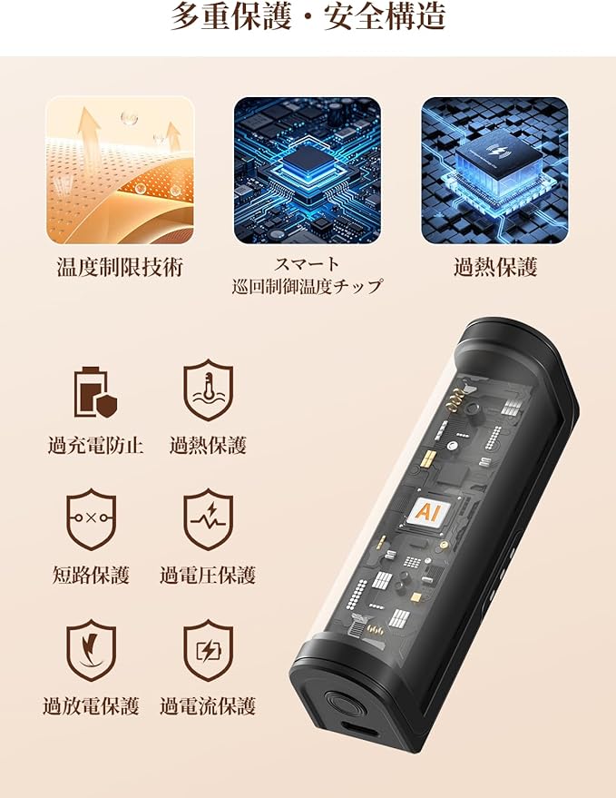【安全保護】充電式カイロはアップグレードされたABSとアルミニウムで作られ、経済産業省のMITE認証合格にも合格しています。また、過充電防止、過熱防止、短絡防止などの各種保護機能を搭載し、安全で快適な暖かさを保ちます。