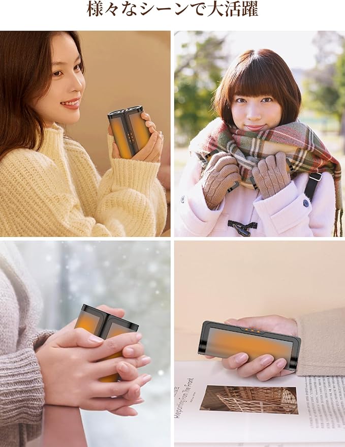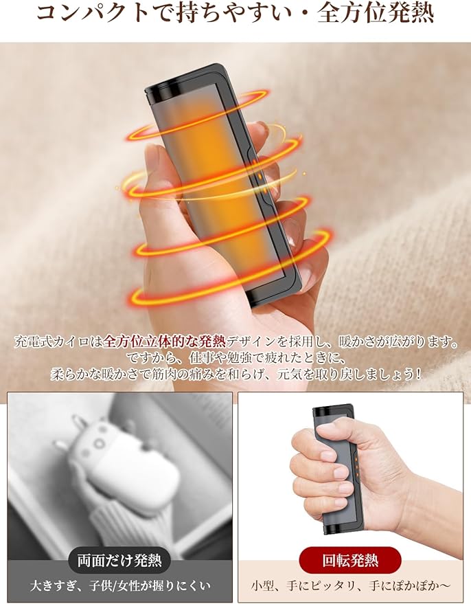【小型軽量で持ち運びしやすい】大人の女性の手のひらより小さいサイズ、重さわずか90g/個で、どこでも持ち運びしやすい電気カイロです。カイロの表面はこだわり工芸で優しい肌触りです。ポケットに入れると、通勤、通学、オフィス、スポーツ、アウトドア、外出の際にご利用いただき、暖かさをいつでも楽しめます。