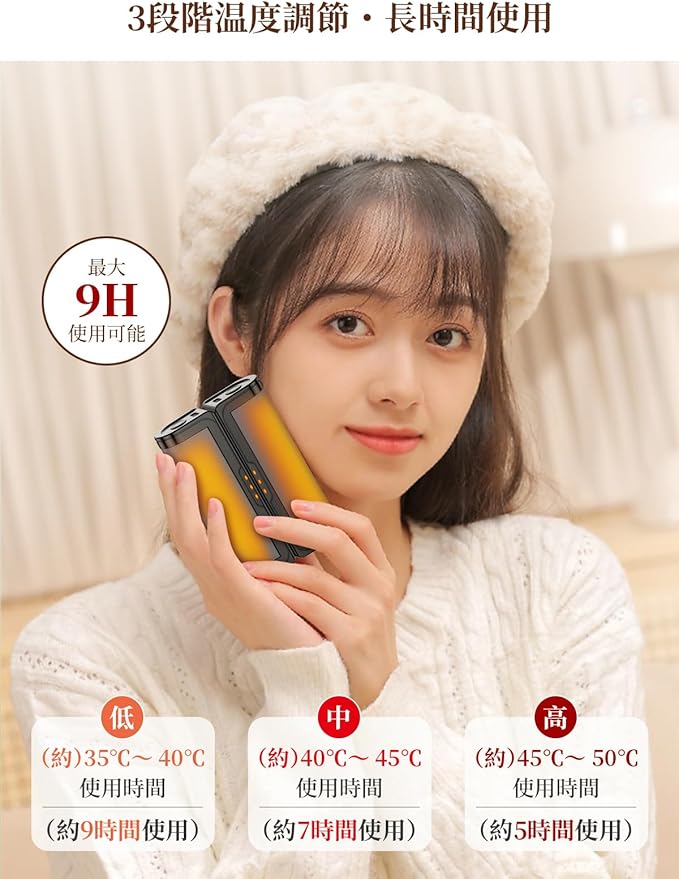 【3段階温度調節】寒い冬を快適に過ごすために、充電式カイロは低温、中温、高温3段階の温度調整することに設定され、低温モード:35-40℃、中温モード:40-45℃、高温モード:45-50℃、あらゆるニーズに対応します。充電式カイロの発熱温度は使用環境の温度に影響されることがあります。 そのため、最高温度は50℃に設定されています。使用環境や自分の好みに合わせて適切な温度調整して良いです。