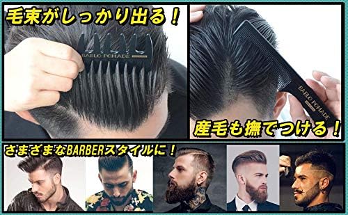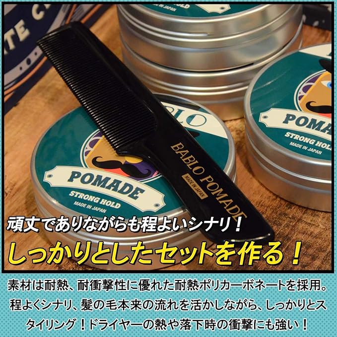 MADE IN JAPANのポマード限定商品“BABLO POMADE(バブロポマード)”のオリジナルコームとメッシュコームのセットアイテム。ポマードでのスタイリングのお供として使えるようクラシカルなデザインに仕上げました。歯の間隔が異なる2種類のコームでお好みのバーバースタイルを。