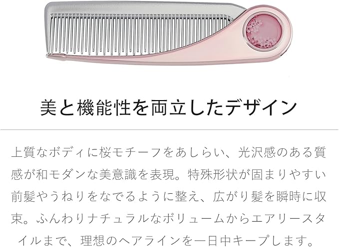 【洗練されたデザイン】桜の花モチーフが施された光沢感あるボディに、シンプルなラインと繊細なテクスチャーが調和。モダンとクラシックの融合から生まれる高級感あふれるビジュアル。ロック機能付きで開いた際にしっかり固定され、スムーズに髪を梳かせます