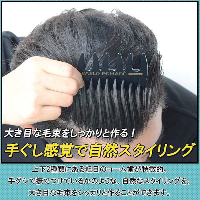 【国産ポマード限定商品】MADE IN JAPANのポマード限定商品“BABLO POMADE”のメッシュコームとオリジナル櫛のセットアイテム。ポマードでのスタイリングのお供として使えるようクラシカルなデザインに仕上げました。