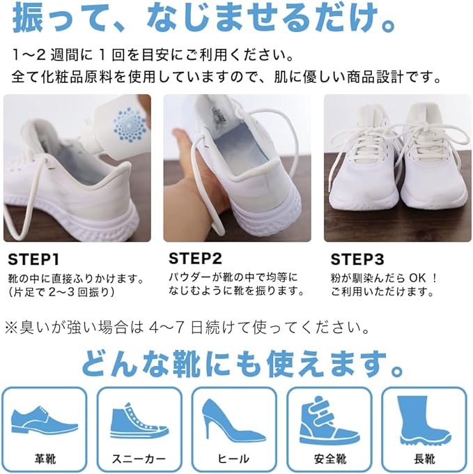 【WILL CLENS(ウィルクレンズ)の使用方法】1〜2週間に1回を目安にご利用ください。①靴の中に直接ふりかけます。(片足で2〜3回振り)②パウダーが靴の中で均等になじむように靴を振ります。③粉が馴染んだらOK!ご利用いただけます。