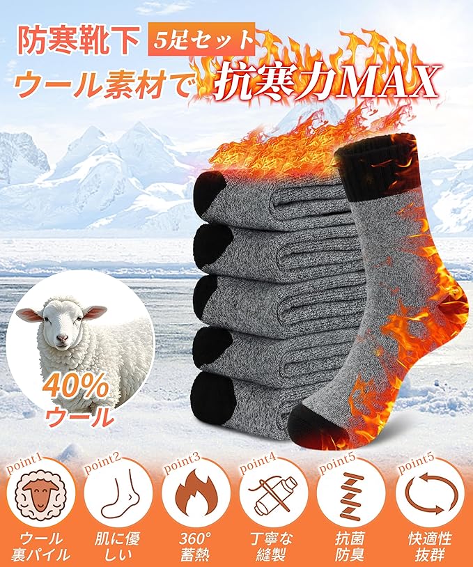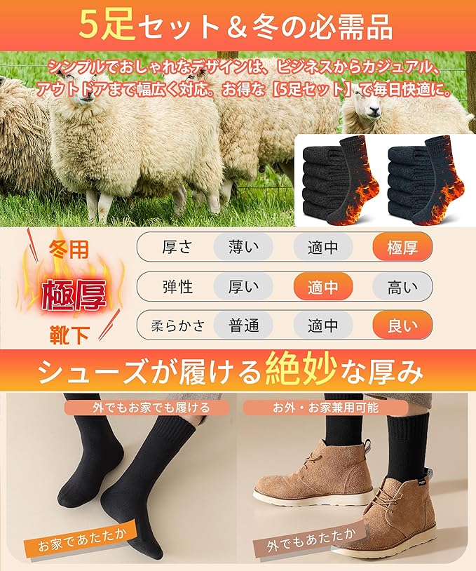 【5足セット&冬の必需品】シンプルでスタイリッシュなデザインはビジネスからカジュアル、アウトドアまで、あらゆるスタイルにマッチします。寒い季節の通勤・通学、室内作業、登山やキャンプなど、さまざまなシーンで活躍します。さらに、お得な【5足セット】で、洗い替えにも困らず毎日快適。冬の毎日を暖かく支える、頼れる一足がたっぷり揃っています。