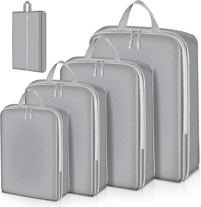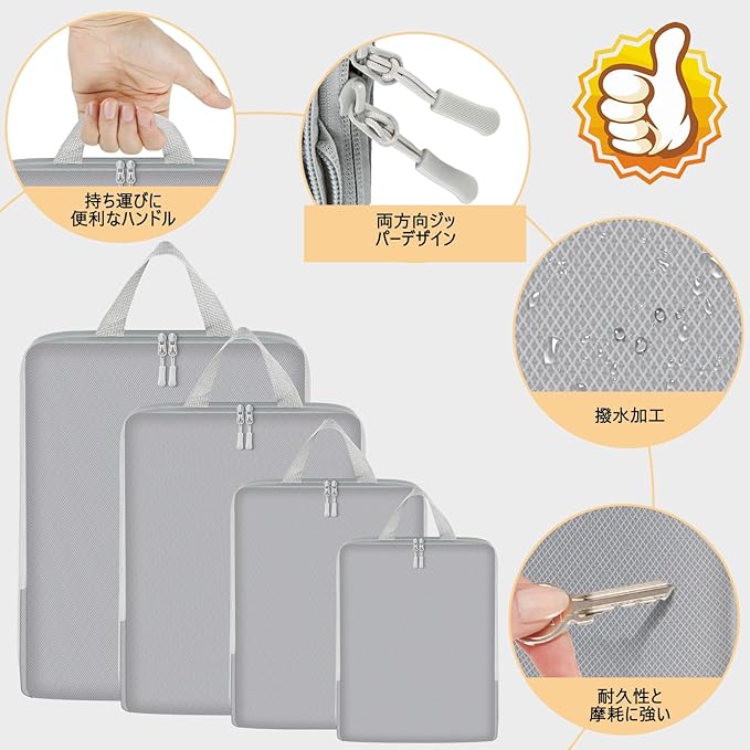 旅行用圧縮袋 トラベルポーチ 便利旅行圧縮バッグ 4点セット シューズバッグ付き 可変スペース 圧縮で衣類スペース 衣類仕分け収納 スペース節約 スーツケース 軽量 出張 旅行 温泉 海外 修学旅行 便利グッズ (グレー)