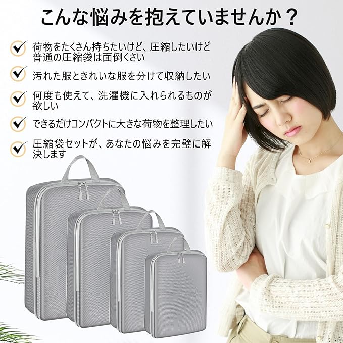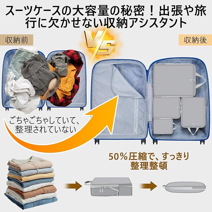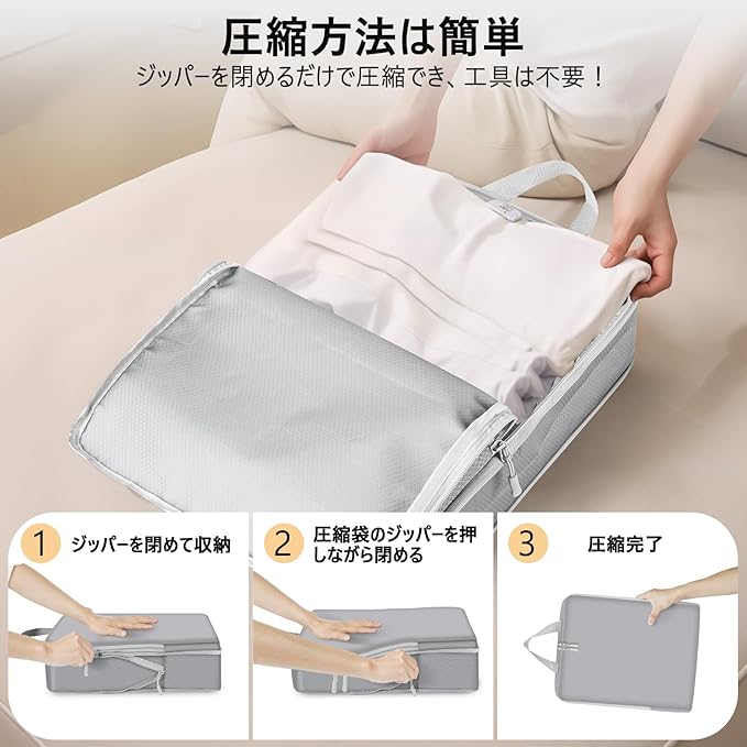 【高い収納力&省スペース設計】独自の圧縮設計により、ジッパーを閉めるだけで体積を約70%圧縮可能。圧縮機不要で、衣類を簡単にコンパクトに整理できます。使わないときは小さいバッグを大きいバッグの中にまとめて収納でき、場所を取りません。