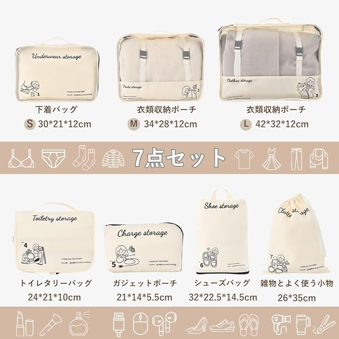 【トラベルポーチ 7セット】衣類収納ポーチ 2、下着バッグ 1、トイレタリーバッグ 1、ガジェットポーチ 1、シューズバッグ 1、雑物とよく使う小物 1。靴、洗面用品、雑貨、よく使う小物、汚れた衣類と清潔な衣類などを分けて収納できるため、衛生的で便利です。スーツケース内をいつも整理整頓された状態に保ちます。