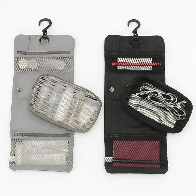 ケースを広げるとバスルームのフックなどに吊るして使えます。着脱できるポーチ付です。