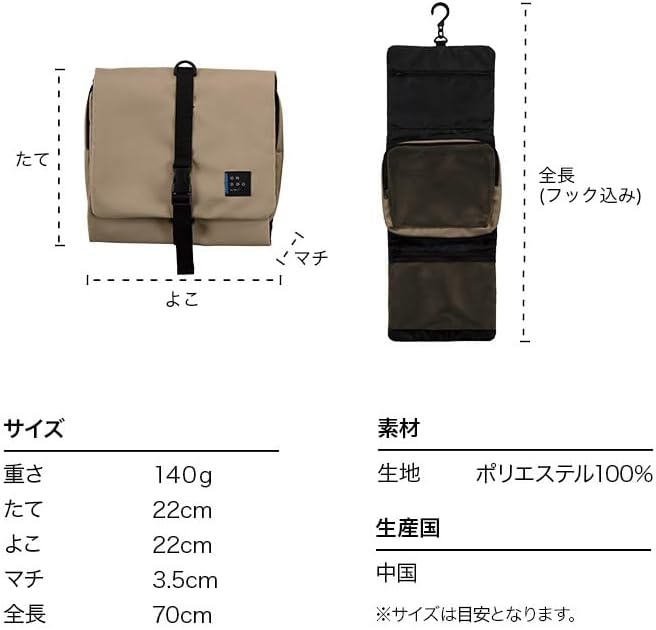 トラベルセットをまとめて収納できる、フック付きポーチ。