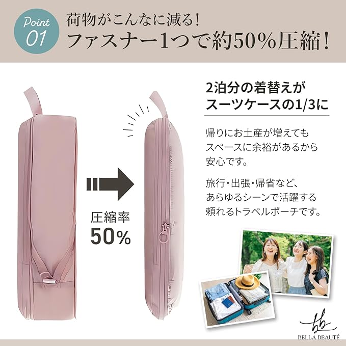 ファスナーひとつで50%圧縮!収納力アップ 荷物がかさばる旅行や出張も安心。ファスナーを閉めるだけで約50%の圧縮が可能。スーツケース内のスペースを有効活用できます。