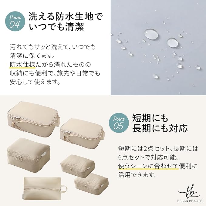用途に合わせて選べる2点&6点セット 衣類、下着、小物を分類して収納できる多サイズ構成。旅行日数や荷物量に合わせて2点・6点セットから選べて便利!
