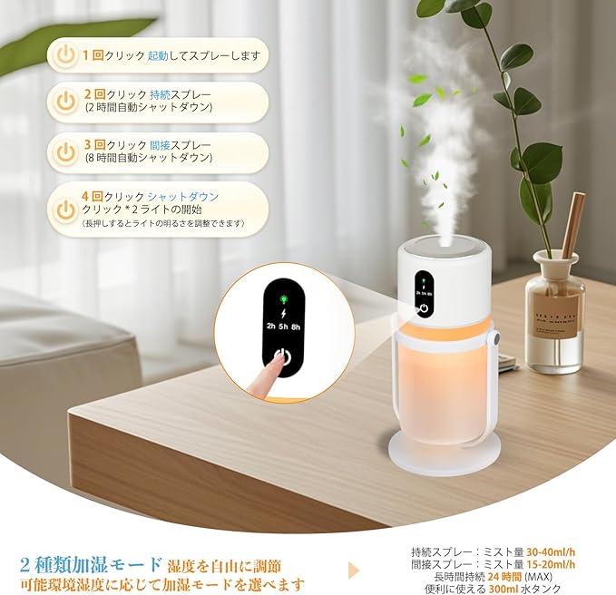 【2 種類噴霧モード&多シーン対応+日本語説明書付き】 連続噴霧(強めの加湿)と間欠噴霧(省電力・長時間使用)の 2 モードを搭載,部屋の大きさや湿度に合わせて柔軟切り替え。オフィス・子供部屋・寝室・車載・家庭用など、多様なシーンで活躍;自動停止機能(連続 2/5 時間・間欠 8 時間後)で過加湿や電力浪費を防ぎます。製品に日本語詳細説明書を同梱,高齢者でも操作方法をすぐ理解でき;12 ヶ月HOT保証を提供,万が一問題が生じた場合は迅速に対応いたします。