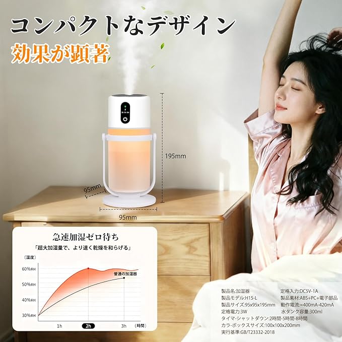 【超音波式超微細ミスト&次亜塩素酸水対応除菌】 高性能超音波振動子で水を約 5μm の超微細ミストに変換,浸透力が強く肌や髪の乾燥を速やかに緩和(秋冬乾燥対策・花粉対策に最適)。300ML 大容量タンクは 1 回満水で長時間加湿をサポート,給水頻度を大幅削減。次亜塩素酸水を適量添加することで除菌効果も発揮,子供部屋や寝室での衛生環境を守ります。空焚き防止機能付き:水量が不足すると自動停止,安全性を最大限確保。