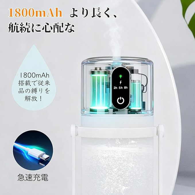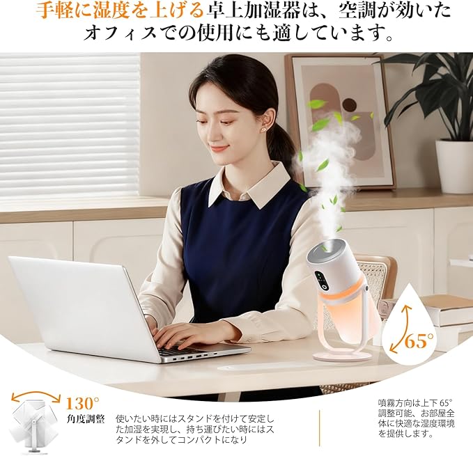 加湿器 卓上 小型【2025 年新モデル 角度調整&1800mAh大容量電池・ステー付き】超音波式 除菌 静音 300ML大容量 Type-C急速充電 自動停止機能 空焚き防止 水漏れ防止 上部給水 暖光LEDライト 乾燥対策 花粉対策 次亜塩素酸水対応 オフィス 子供部屋 寝室 車載 家庭用 日本語説明書付き