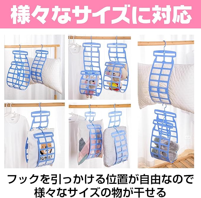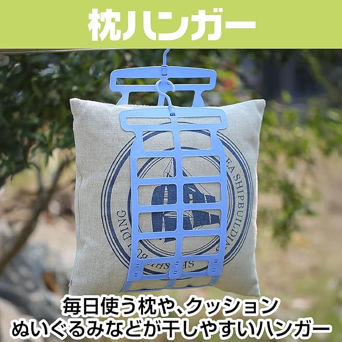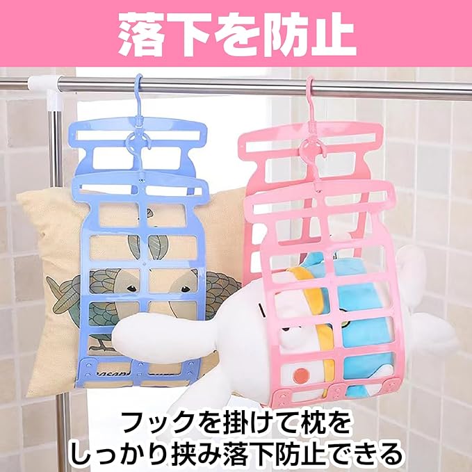 【大きめ枕やぬいぐるみの干しに最適】 この枕ハンガーは、大きめの枕やクッション、ぬいぐるみを干すのに最適です。特に湿気が気になる季節には、しっかり干して風通しを良くすることで、清潔に保つことができます。お部屋やベランダで簡単に吊るすだけで、いつでも快適なアイテムに。