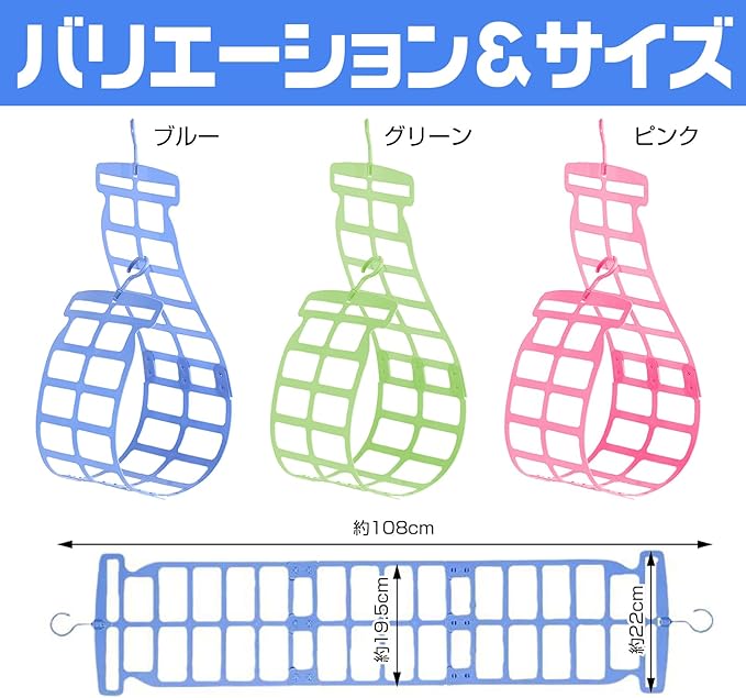 【サイズ調整可能で幅広い用途に対応】 全長約110cmのロングサイズで、大きな枕やぬいぐるみなども安心して干せます。3枚のシートが連結できるため、サイズ調整が可能で、さまざまな形状や大きさのものに対応。簡単にフックに掛けるだけで、洗濯物を効率よく干せる便利な設計です。