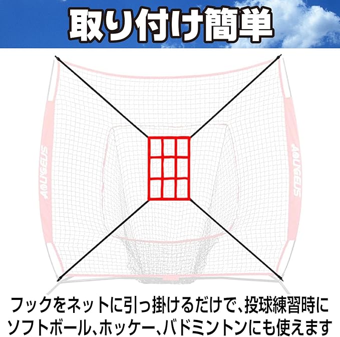 【簡単な取り付けで手軽に使用】 このターゲットは、4本のストラップに付いたフックをネットに引っ掛けるだけで簡単にセットアップできます。長期間の使用に耐えるように、四隅の接合部には耐久性を高めるダブルステッチが施されています。投球練習だけでなく、ソフトボールやバドミントン、ホッケーなど多用途に使える便利なアイテムです。