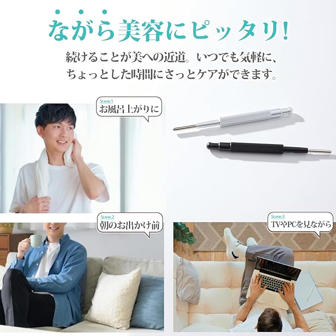 【ながら時間にぴったり】 コンパクトで軽量なため、忙しい日常のスキマ時間にも手軽に使えるのがポイント。お風呂上がりや朝の準備前、または外出先でも手軽にセルフケアを取り入れられます。