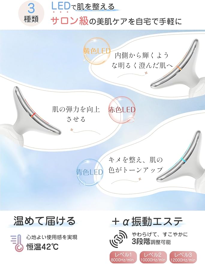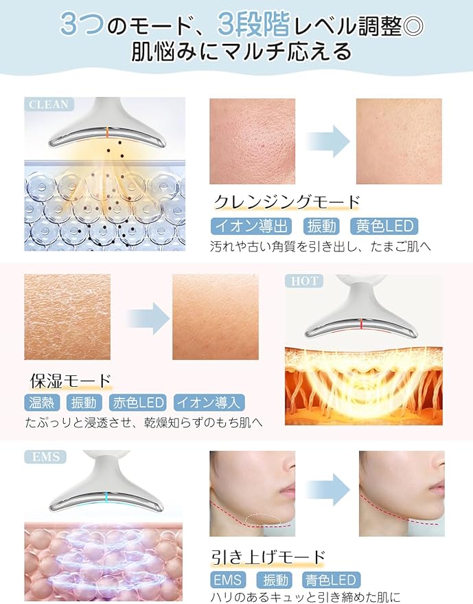 【LED光・イオン導出・イオン導入】黄色、赤色、青色の3色LED機能が搭載され、サロン級のケアを自宅で手軽に!全モードの強さが三段階調節、お好きみに合わせて強さ調節が可能です。