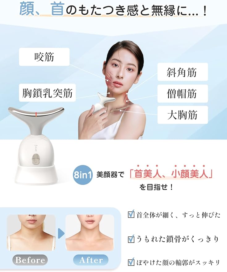 美顔器 1台8役 EMS 美顔ローラー LED光 かっさ 電動 温熱 多機能 イオン導入 導出 光エステ 振動エステ 三のモード 3段階レベル 持ち運び便利 家庭用美顔器 誕生日 母の日 プレゼント ホワイト