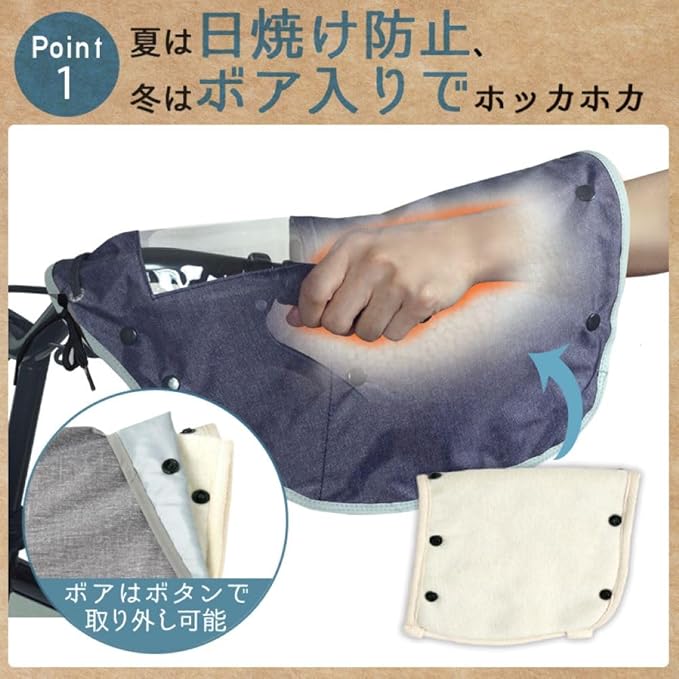 ・夏の暑い時期にはハンドルカバー内のボアを取り外し真夏の太陽の紫外線防止/UVカットとしても使えるので使い勝手の良いハンドルカバーです。 ・クリアな窓を搭載。変速ギアの確認やアシスト機能操作などの自由に操作が行えます。 ・ハンドルカバーの取り外しもとても簡単です。