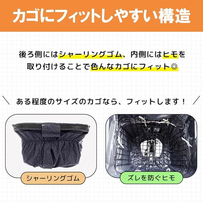 同色後かごカバー別売(MY-170)と一緒に使えば、前後の自転車カバー色を揃えることができます。 ※商品の色はブラウザやお使いのモニターの仕様、設定により実際の商品と異なる場合がありますのでご了承くだい。 ※使用や洗濯を繰り返すことで撥水は低下します。