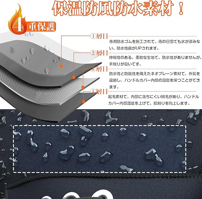 【4層構造 防風防保温性up!】原付用ハンドルカバーを使用する目的の第一は、防寒です。offereeのハンドルウォーマーはすきま風も通さないような素材---ネオプレーンを採用し、ネオプレーンは最初にウェットスーツに使用されました、高い防水性と防風性能で雨や雪、寒風から手を保護します。また高級防水レベルーのゴムを塗せます、防水性能を高めます。生地自体が風を通さない仕組みになってい、グリップやレバーからのすきま風が入りにくい構造で、また手を通す入り口付近がオープンなものではなくリブ素材で、防風性能がup!裏側にボアがついているものは、ボアが空気層を貯えるので熱を留めやすい、保温性に優れたデザインです。