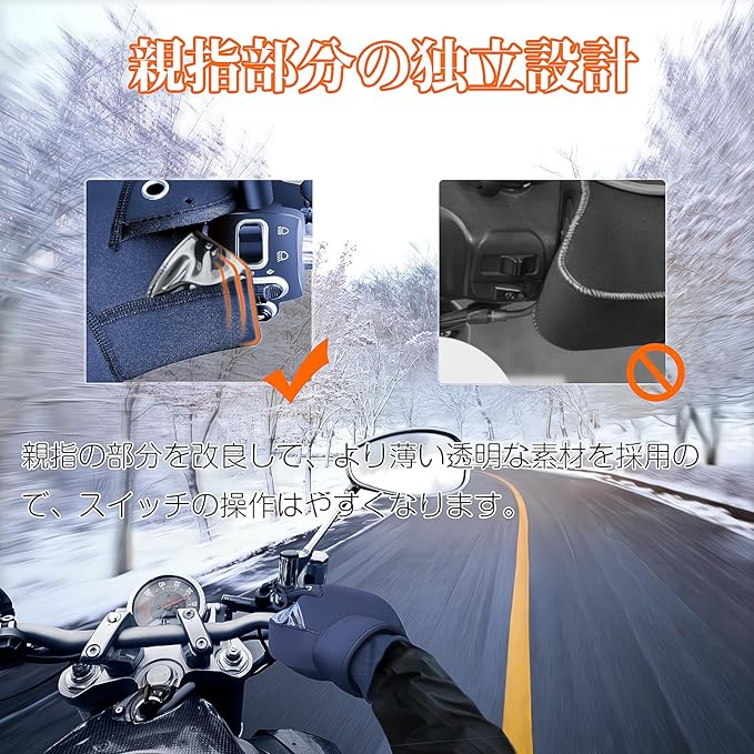 【原付の運転を妨げないつくりのものを】内側はゆったりとした設計で、グローブを着けたままでもスムーズに出し入れや操作ができて便利です。ハンドルカバー内で、アクセル、ブレーキはもちろん、方向指示器(ウィンカー)を出す際にスムーズに操作でき、つまり、ハンドルカバー内である程度自由に手を動かせる可動域が大きいです。外からスイッチ操作が見えやすいよう、親指部分のみ透明窓をつけているバイク用ハンドルカバーです。
