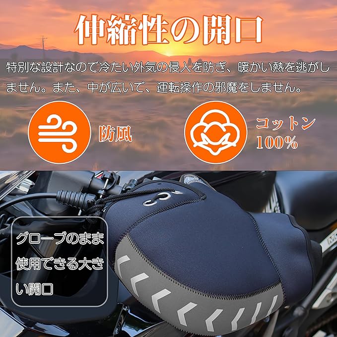 【NEWモデルバイク用ハンドルカバー ユニバーサルデザイン】バイク用ハンドルカバーは汎用性の高いユニバーサルデザインを採用し、原付から大型バイクまで広く使えます。ブレーキレバーとグリップをハンドルカバーに差し込んで紐で固定する、ミトンタイプのハンドルカバーです。