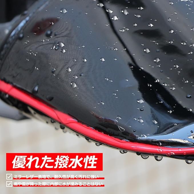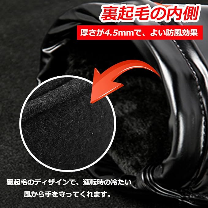 ✺【高密度ミラーレザー表地・撥水性】:カバーの表面に撥水コーティングが加工されますので、冬の雨や雪が降った際の運転時にハンドルカバー内部に水が浸みることはありません。厚さが4.5mmで、グローブを着用しなくでも、走行時の冷たい風から手を守ってくれて、寒い冬に必需品になります。
