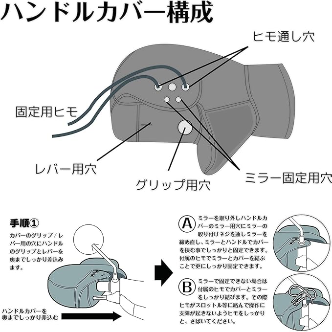 ●ハンドルカバーを付属のヒモ等で車体に固定する際には、ブレーキ及びスロットルへ干渉しないよう,またハンドルやタイヤに巻き込まないように十分にご注意ください。
