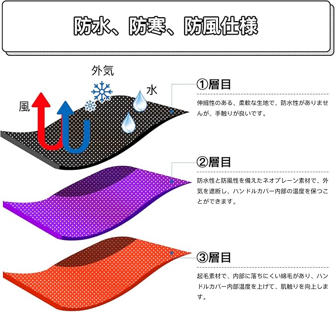 【高級なネオプレーン材質】バイクハンドルカバーは3層の異なる生地で構成されています。1層目は伸縮性の高い生地で、2層目はネオプレーン材質で、3層目は起毛素材です。柔らかさ、防風、防水、保温の機能を十分に発揮します。