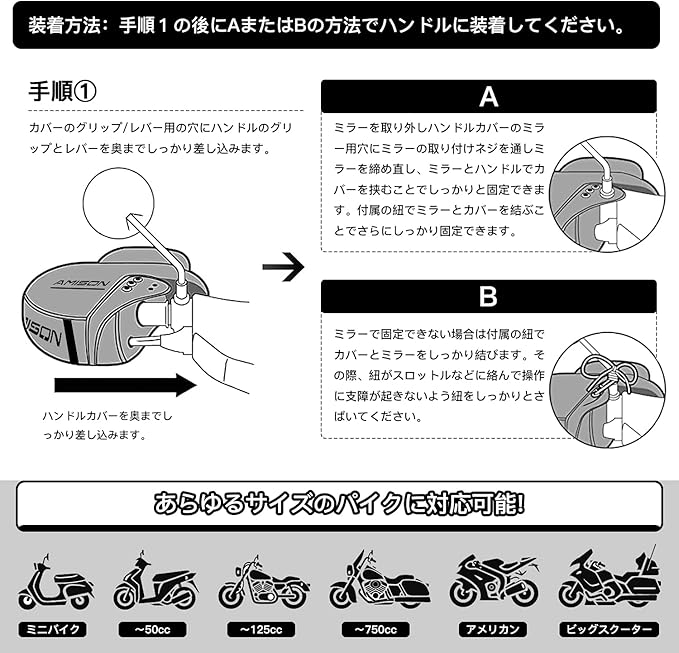 【汎用タイプ】バイクハンドルウォーマーは主に秋と冬に使用されます。いくつかの特殊型のバイクを除き、殆どの大、中、小型のバイクに適用します。ハンドルバーの仕様によって、2種類の取り付け方法があります。
