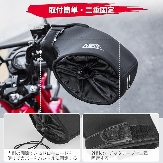 【取付簡単】ハンドルグリップとクラッチレバーに差し込むだけで完成!また、内側のドローコードと外側のマジックテープを使うことで、ハンドルによりしっかり装着できます。