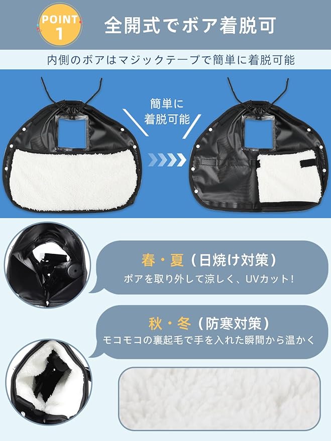 【ボア着脱可】:取り外しができるボア付自転車ハンドルカバー。防寒対策や紫外線対策としてオールシーズン使うことができます。